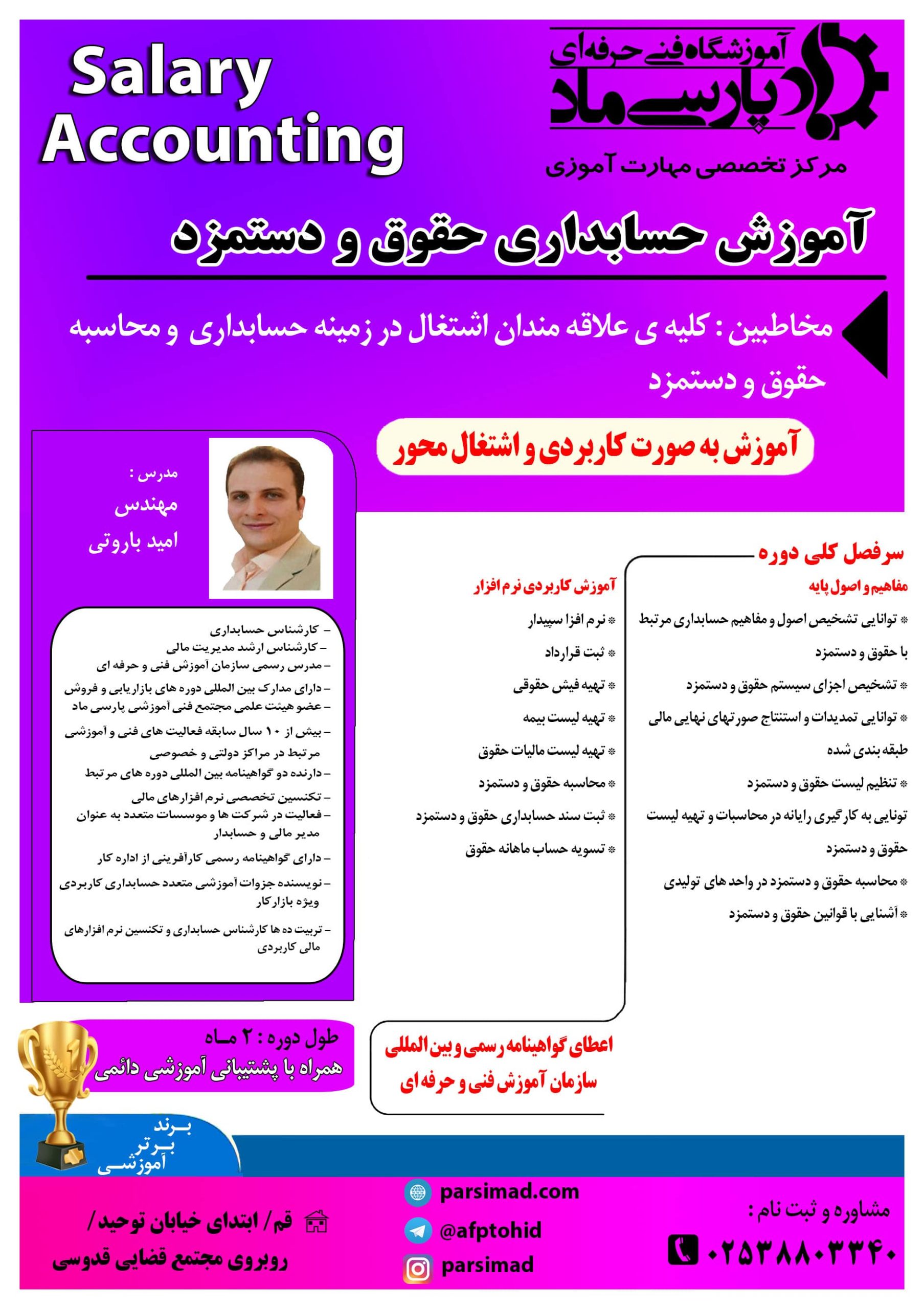 آموزش عملی حسابداری خدماتی و بازرگانی، ثبت اسناد مالی، حقوق و دستمزد، انبارداری و امور مالیاتی.
